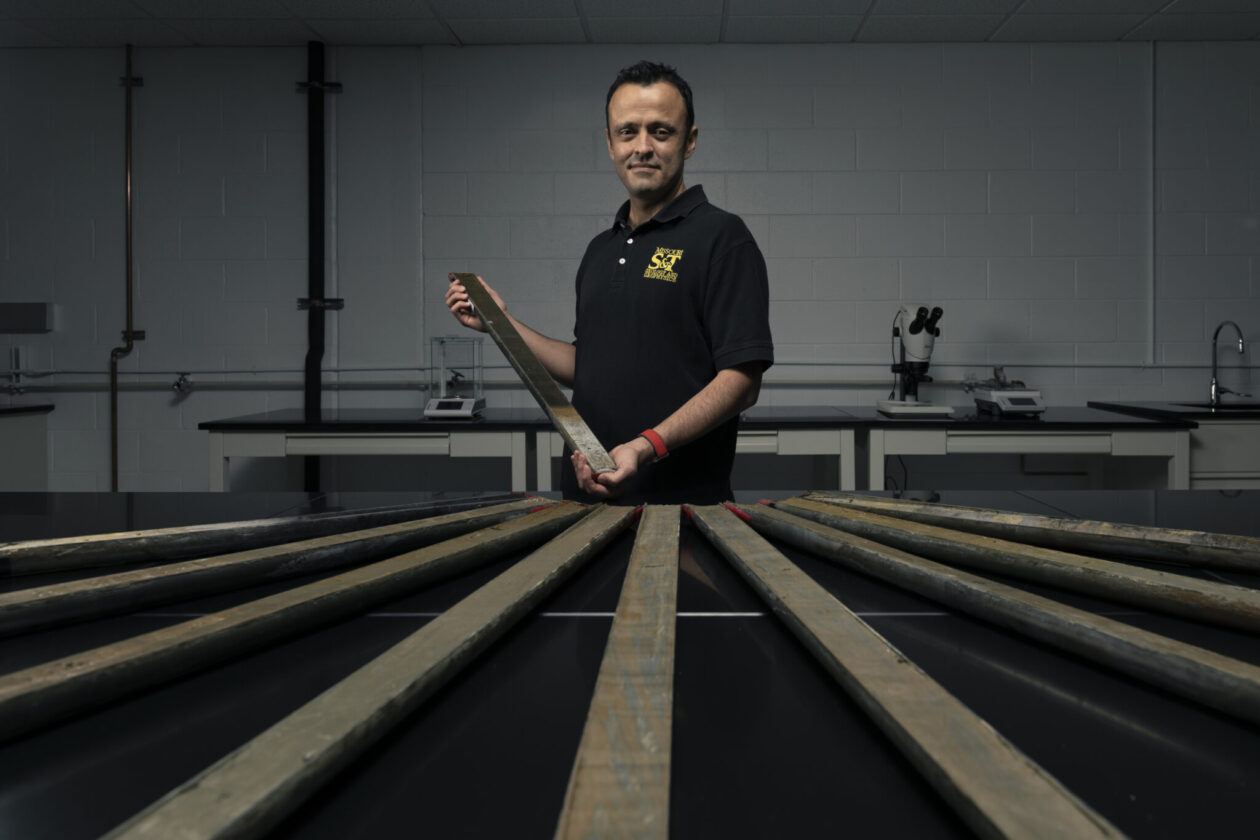 Dr. Jonathan Obrist-Farner stands with sediment core samples used for his research in a Missouri S&T lab. Photo by Michael Pierce/Missouri S&T.