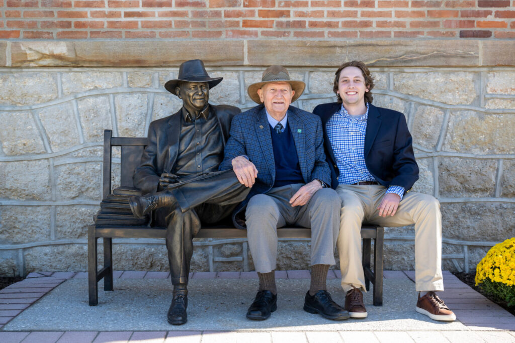 Gary Havener and his grandson, Nathan Hughes, a Ph.D. student at S&T, pose for a picture following a ceremony to celebrate the Havener Arrival Complex. A statue in Havener’s likeness was unveiled outside of the Rolla Building on Oct. 1, 2025. Photo by Michael Pierce/Missouri S&T.