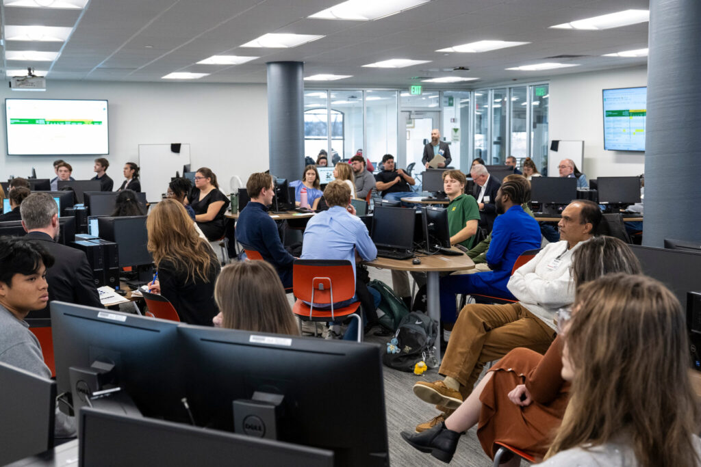 An Enterprise Resource Planning class gathers to present their project showcase to a panel of judges in December. The ERP program combines core business processes with IT and provides students with hands-on learning experiences. Photo by Blaine Falkena/ Missouri S&T.